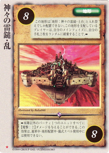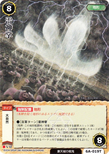 ![]() ![]() | 6A-019T 雷神掌 地形 雷姫 ● ブロック:V/VI リミット:8 勢力:豪天城の戦鬼 タイプ:大自然 【強制配置】地形(本陣を除く地形のあるエリアに配置できる) ●[自軍ターン]雷神掌 〈発揮:この地形配置時/対象:この地形に存在する敵軍ユニット1体〉 自軍プレイヤーは手札を1枚破棄してもよい。この効果で破棄したカードが「種族:鬼神衆」であり、かつ対象が「レベル:即時召喚可能」の場合、対象に【3D】ダメージ(この効果のダイスを振る前に、敵軍プレイヤーは対象の存在するパーティ内で装備品を持ち替えてもよい)。 illustrated by 巴ヨシヤス |