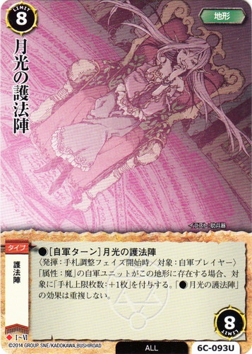 ![]() ![]() | 6C-093U 月光の護法陣 地形 アゾールの黒い旋風 ◆ ブロック:V/VI リミット:8 勢力:ALL タイプ:護法陣 ●[自軍ターン]月光の護法陣 〈発揮:手札調整フェイズ開始時/対象:自軍プレイヤー〉 「属性:魔」の自軍ユニットがこの地形に存在する場合、対象に「手札上限枚数:+1枚」を付与する。「●月光の護法陣」の効果は重複しない。 illustrated by 助兵器 |