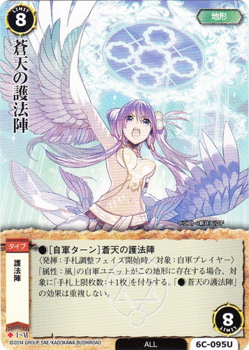 ![]() ![]() | 6C-095U 蒼天の護法陣 地形 アゾールの黒い旋風 ◆ ブロック:V/VI リミット:8 勢力:ALL タイプ:護法陣 ●[自軍ターン]蒼天の護法陣 〈発揮:手札調整フェイズ開始時/対象:自軍プレイヤー〉 「属性:風」の自軍ユニットがこの地形に存在する場合、対象に「手札上限枚数:+1枚」を付与する。「●蒼天の護法陣」の効果は重複しない。 illustrated by 新井テル子 |