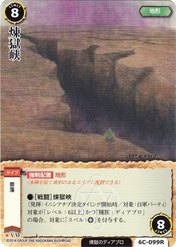 ![]() ![]() | 6C-099R 煉獄峡 地形 アゾールの黒い旋風 ★ ブロック:V/VI リミット:8 勢力:煉獄のディアブロ タイプ:奈落 【強制配置】地形(本陣を除く地形のあるエリアに配置できる) ●[戦闘]煉獄峡 〈発揮:イニシアチブ決定タイミング開始時/対象:自軍パーティ〉 対象が「レベル:6以上」かつ「種族:ディアブロ」の場合、対象に「スペル:*」を付与する。 illustrated by 巴ヨシヤス |