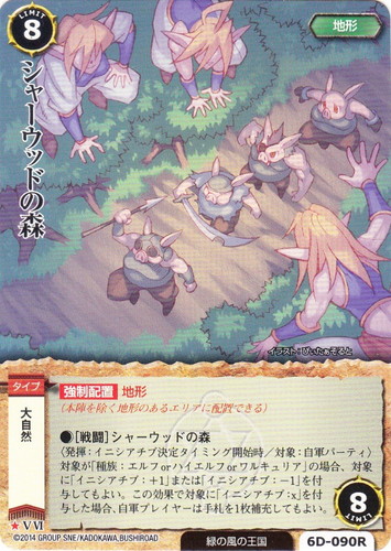 ![]() ![]() | 6D-090R シャーウッドの森 地形 悠久のハルシオン ★ ブロック:V/VI リミット:8 勢力:緑の風の王国 タイプ:大自然 【強制配置】地形(本陣を除く地形のあるエリアに配置できる) ●[戦闘]シャーウッドの森 〈発揮:イニシアチブ決定タイミング開始時/対象:自軍パーティ〉 対象が「種族:エルフorハイエルフorワルキュリア」の場合、対象に「イニシアチブ:+1」または「イニシアチブ:-1」を付与してもよい。この効果で対象に「イニシアチブ:n」を付与した場合、自軍プレイヤーは手札を1枚補充してもよい。 illustrated by ぴぃたぁそると |