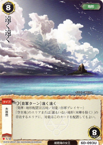 ![]() ![]() | 6D-093U 遠く遠く 地形 悠久のハルシオン ◆ ブロック:V/VI リミット:8 勢力:紺碧海の女王 タイプ:大自然 ◇[自軍ターン]遠く遠く 〈発揮:地形配置宣言時/対象:自軍プレイヤー〉 「空き地」のエリアまたは「誰もいない地形(本陣を除く)」の存在するエリアに、対象はこのカードを配置してもよい。 illustrated by 津田沼人 |