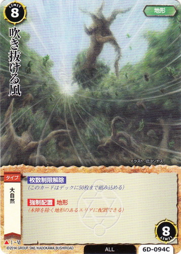![]() ![]() | 6D-094C 吹き抜ける風 地形 悠久のハルシオン ▲ ブロック:I/II/III/IV/V/VI リミット:8 勢力:ALL タイプ:大自然 【枚数制限解除】(このカードはデックに50枚まで組み込める) 【強制配置】地形(本陣を除く地形のあるエリアに配置できる) illustrated by 巴ヨシヤス |