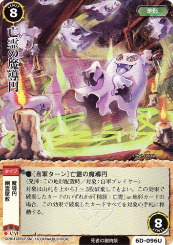 ![]() ![]() | 6D-096U 亡霊の魔導円 地形 悠久のハルシオン ◆ ブロック:V/VI リミット:8 勢力:死者の謝肉祭 タイプ:幽霊屋敷/魔導円 ●[自軍ターン]亡霊の魔導円 〈発揮:この地形配置時/対象:自軍プレイヤー〉 対象は山札を上から1~3枚破棄してもよい。この効果で破棄したカードのいずれかが「種族:亡霊」or地形カードの場合、この効果で破棄したカードすべてを対象の手札に移動する。 illustrated by KIYA |