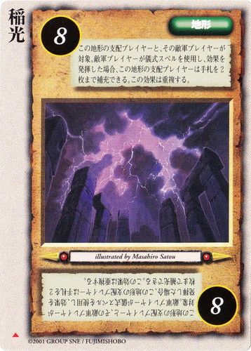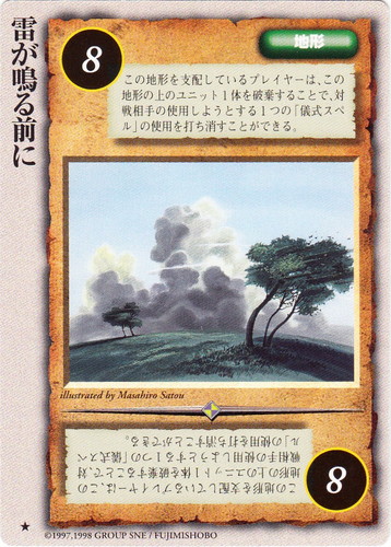 ![]() ![]() | 雷が鳴る前に 地形 モンスター・コレクション ★ リミット:8 この地形を支配しているプレイヤーは、この地形の上のユニット1体を破棄することによって、対戦相手の使用しようとする1つの「儀式スペル」の効果を打ち消すことができる。 illustrated by Masahiro Satou |