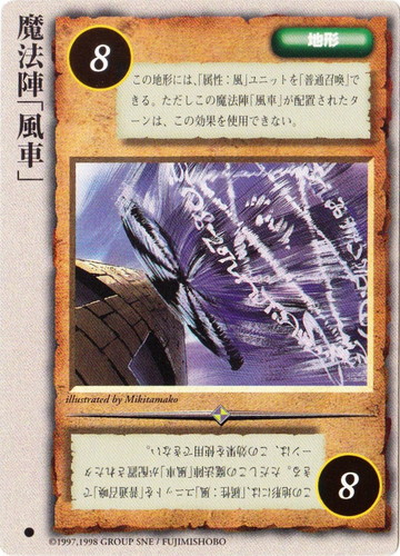 ![]() ![]() | 魔法陣「風車」 地形 モンスター・コレクション ● リミット:8 この地形には、「属性:風」ユニットを「普通召喚」できる。ただしこの魔法陣「風車」が配置されたターンは、この効果を使用できない。 illustrated by Mikitamako |