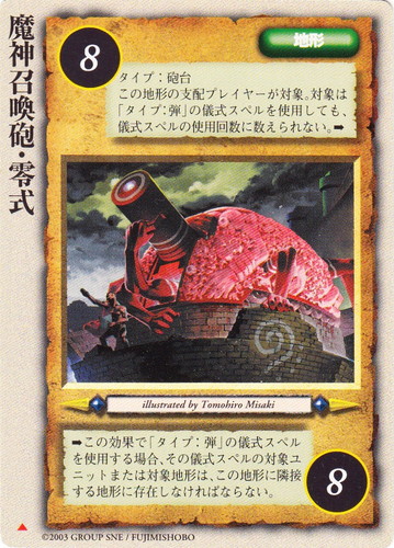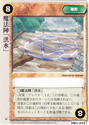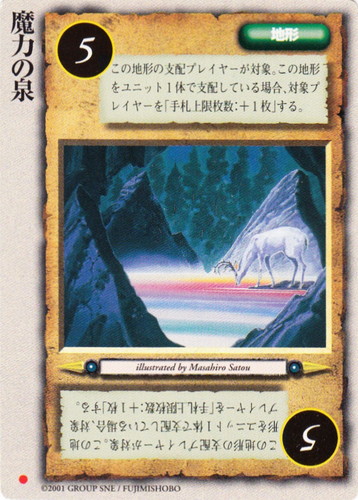![]() ![]() | 魔法陣「泉」 地形 モンスター・コレクション ● リミット:8 この地形には、「レベル:3」以下のユニットを「普通召喚」できる。ただしこの魔法陣「泉」が配置されたターンは、この効果を使用できない。 illustrated by Mikitamako |
