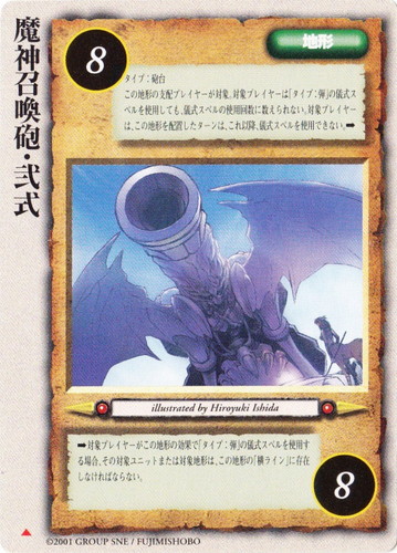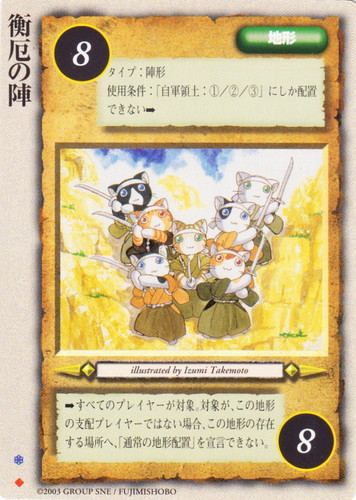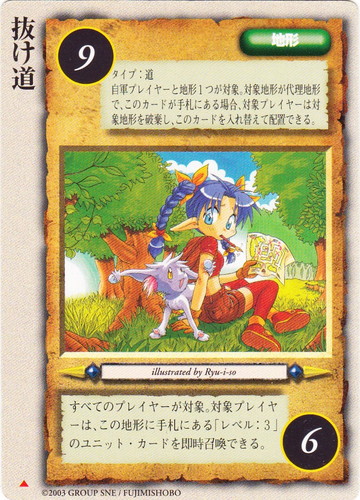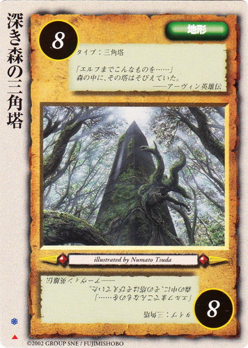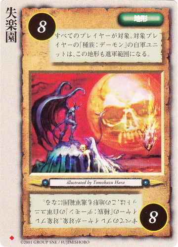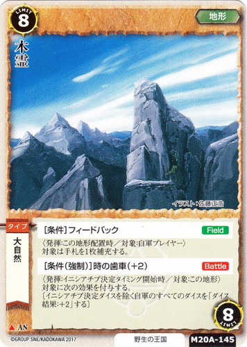 ![]() ![]() | 木霊 地形 モンスター・コレクション ◆ リミット:8 この地形での戦闘は、すべてのダイス目が「×2」される。 illustrated by Masahiro Satou |