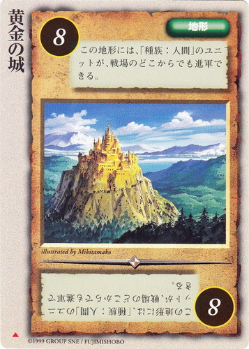 ![]() ![]() | 黄金の城 地形 黄金樹の守護者 ▲ リミット:8 この地形には「種族:人間」のユニットが、戦場のどこからでも進軍できる。 illustrated by Mikitamako |