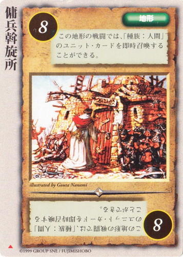 ![]() ![]() | 傭兵斡旋所 地形 黄金樹の守護者 ▲ リミット:8 この地形の戦闘では、「種族:人間」のユニット・カードを即時召喚することができる。 illustrated by Gouta Nanami |