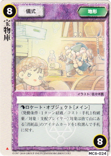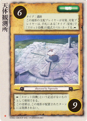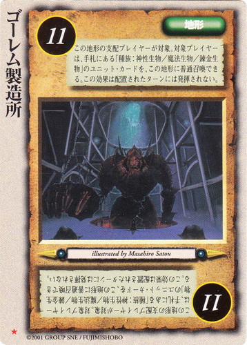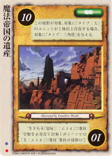 ![]() ![]() | 工房 地形 古代帝国の遺産 ★ リミット:8 この地形で戦闘中に「使用」され、効果を発揮した「アイテム(消耗品)」は、捨て山ではなくそれぞれのプレイヤーの山札の一番上に戻る。 illustrated by Masahiro Satou |