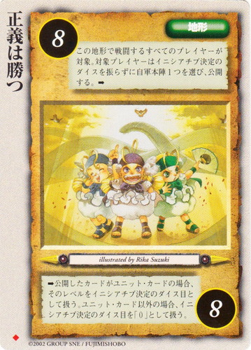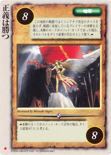 ![]() ![]() | 正義は勝つ 地形 空中庭園の降臨 ◆ リミット:8 この地形の戦闘ではイニシアチブ決定のダイスを振らず、戦闘に参加しているプレイヤーの本陣を公開し、本陣カードがユニット・カードであった場合、そのレベルをダイス結果の代わりとして使う。本陣のカードがユニット・カード以外の場合、ダイス結果が「0」と考える。 illustrated by Mitsuaki Sagiri |