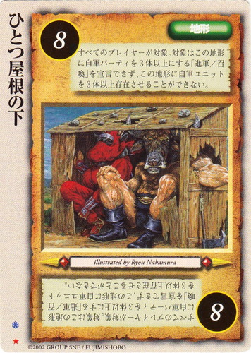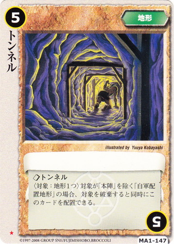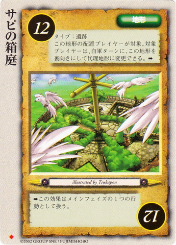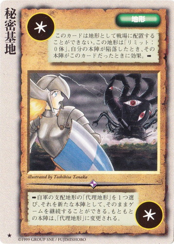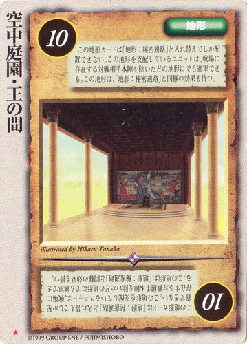 ![]() ![]() | 秘密基地 地形 空中庭園の降臨 ★ リミット:* このカードは地形として戦場に配置することができない。この地形は「リミット:0体」。自分の本陣が陥落したとき、その本陣がこのカードだったときに効果。自軍の支配地形の「代理地形」を1つ選び、それを新たな本陣として、そのままゲームを継続することができる。もともとの本陣は、「代理地形」に変更される。 illustrated by Toshihisa Tanaka |