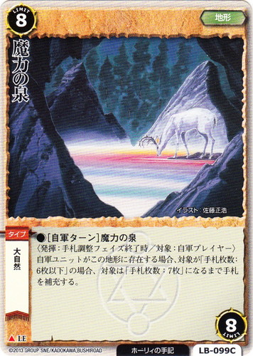 ![]() ![]() | LB-099C 魔力の泉 地形 不滅なる聖騎士 ▲ ブロック:LE リミット:8 勢力:ホーリィの手記 タイプ:大自然 ●[自軍ターン]魔力の泉 〈発揮:手札調整フェイズ終了時/対象:自軍プレイヤー〉 自軍ユニットがこの地形に存在する場合、対象が「手札枚数:6枚以下」の場合、対象は「手札枚数:7枚」になるまで手札を補充する。 illustrated by 佐藤正浩 |