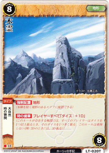 ![]() ![]() | LT-020T 木霊 地形 ホーリィの手記 ● ブロック:LE リミット:8 勢力:ホーリィの手記 タイプ:時の狭間/大自然 【強制配置】地形 (本陣を除く地形のあるエリアに配置できる) 【時の歯車】プレイヤーすべて「ダイス:+1D」(このルールが存在する戦闘では、すべてのプレイヤーはダイスを1つ以上振るとき、そのダイスを1つ多く振る。このルールは重複しない(例:2Dのときは、3D振る)) illustrated by 佐藤正浩 |