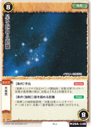 ![]() ![]() | M20A-148 星を掴める距離 地形 太陽の金の竜姫 ▲ ブロック:AN リミット:8 勢力:ALL タイプ:大自然 [条件]予兆【Battle】 〈発揮:イニシアチブ決定タイミング開始時/対象:自軍プレイヤー〉 対象が進軍側の場合、対象は手札を1枚補充する。 [条件(強制)]星を掴める距離【Battle】 〈発揮:この地形配置時/対象:自軍ユニットすべて〉 ターん終了まで、対象に「進軍範囲:この地形」を付与する。 illustrated by 佐藤正浩 |