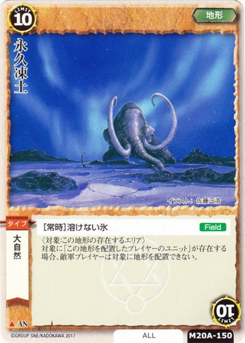 ![]() ![]() | M20A-150 永久凍土 地形 太陽の金の竜姫 ▲ ブロック:AN リミット:10 勢力:ALL タイプ:大自然 [常時]溶けない氷【Field】 〈対象:この地形の存在するエリア〉 対象に「この地形を配置したプレイヤーのユニット」が存在する場合、敵軍プレイヤーは対象に地形を配置できない。 illustrated by 佐藤正浩 |