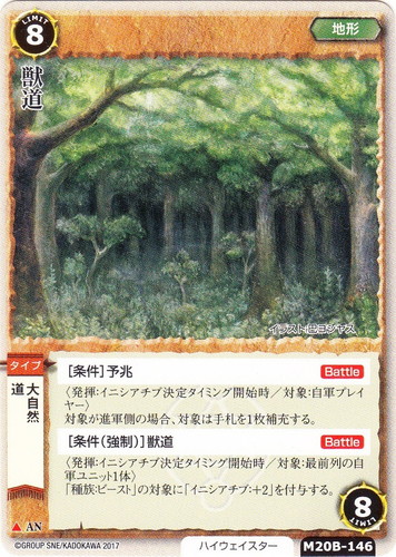 ![]() ![]() | M20B-146 獣道 地形 月の銀の魔狼 ▲ ブロック:AN リミット:8 勢力:ハイウェイスター タイプ:道/大自然 [条件]予兆【Battle】 〈発揮:イニシアチブ決定タイミング開始時/対象:自軍プレイヤー〉 対象が進軍側の場合、対象は手札を1枚補充する。 [条件(強制)]獣道【Battle】 〈発揮:イニシアチブ決定タイミング開始時/対象:最前列の自軍ユニット1体〉 「種族:ビースト」の対象に「イニシアチブ:+2」を付与する。 illustrated by 巴ヨシヤス |