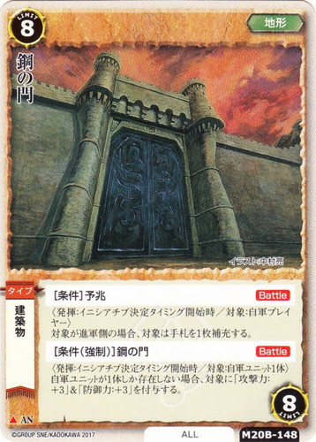 ![]() ![]() | 鋼の門 地形 モンスター・コレクション ★ リミット:* この地形の「リミット」はユニット1体。この地形に存在するユニットは「レベル」がいくつでもよい。 illustrated by Ryou Nakamura |
