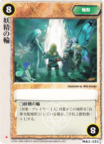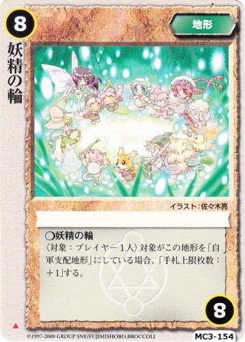 ![]() ![]() | 妖精の輪 地形 モンスター・コレクション ● リミット:8 この地形を支配しているプレイヤーは、「手札上限枚数:+1枚」する。 illustrated by Mila Aizawa |
