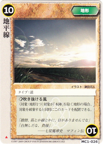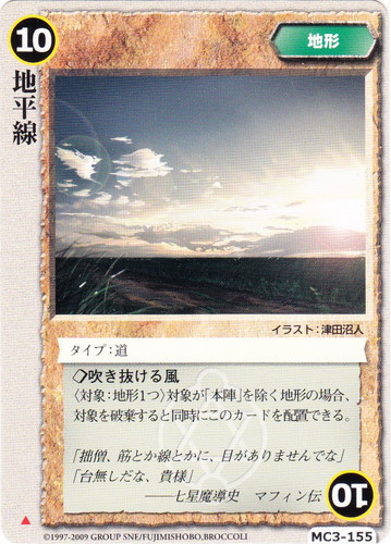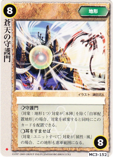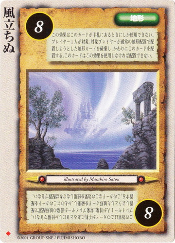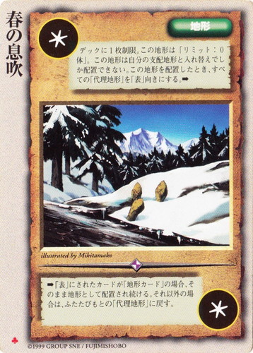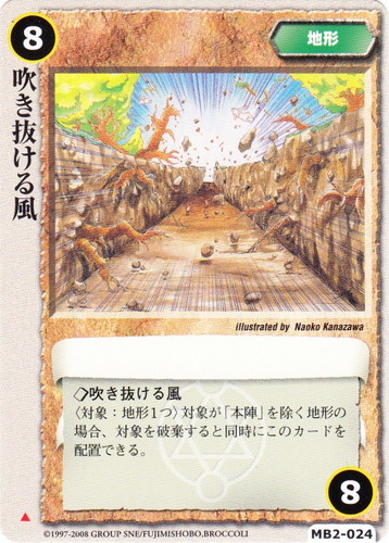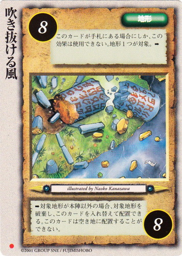 ![]() ![]() | 吹き抜ける風 地形 モンスター・コレクション ◆ リミット:8 この地形は、すでに地形が配置されている場所ならば、どこでも強制的に入れ替えて配置できる。ただし、入れ替えでしか配置できず、本陣と入れ替えることはできない。 illustrated by Naoko Kanazawa |