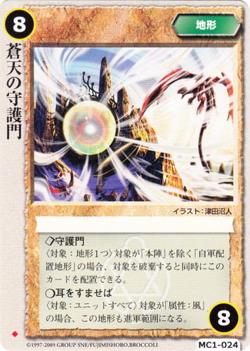 ![]() ![]() | 空を見上げて 地形 モンスター・コレクション ▲ リミット:8 この地形には、これを配置したプレイヤーの「属性:風」ユニットが、戦場のどこからでも進軍できる。 illustrated by Masahiro Satou |