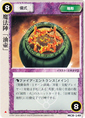 ![]() ![]() | 魔法陣「油壷」 地形 モンスター・コレクション ● リミット:8 この地形には、「属性:火」ユニットを「普通召喚」できる。ただしこの魔法陣「油壷」が配置されたターンは、この効果を使用できない。 illustrated by Mikitamako |