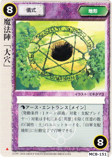 ![]() ![]() | 魔法陣「大穴」 地形 モンスター・コレクション ● リミット:8 この地形には、「属性:土」ユニットを「普通召喚」できる。ただしこの魔法陣「大穴」が配置されたターンは、この効果を使用できない。 illustrated by Mikitamako |
