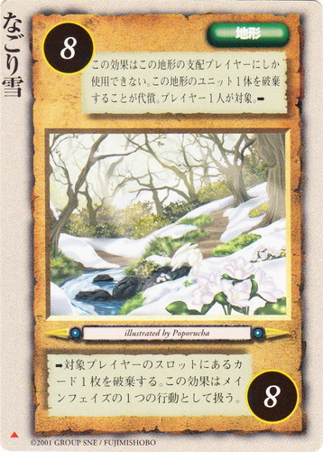 ![]() ![]() | 白い息をはいて 地形 モンスター・コレクション ◆ リミット:8 この地形上に存在するすべてのユニットは「アイテム:X」を失う。「アイテム(装備品)」を装備しているユニットは、すべての「アイテム(装備品)」を破棄すること。 illustrated by Masahiro Satou |