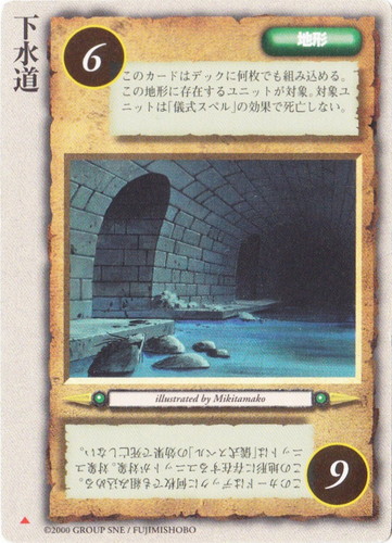 ![]() ![]() | 下水道 地形 太陽王の覚醒 ▲ リミット:6 このカードはデックに何枚でも組み込める。 この地形に存在するユニットが対象。対象ユニットは「儀式スペル」の効果で死亡しない。 illustrated by Mikitamako |