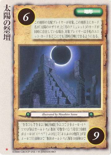 ![]() ![]() | 太陽の祭壇 地形 太陽王の覚醒 ★ リミット:6 この地形の支配プレイヤーが対象。この地形上にカード名が「太陽のロザリオ」と「月のアミュレット」のカードが同時に存在している場合、対象プレイヤーは手札のユニット・カードをどこにでも「即時召喚」できるようになる。 illustrated by Masahiro Satou |