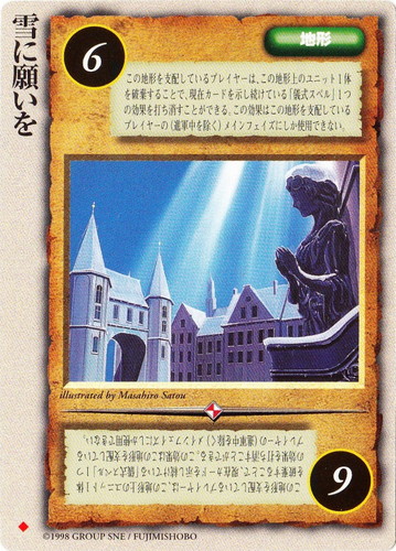 ![]() ![]() | 雪に願いを 地形 魔道士の黙示録 ◆ リミット:6 この地形を支配しているプレイヤーは、この地形上のユニット1体を破棄することで、現在カードを示し続けている「儀式スペル」1つの効果を打ち消すことができる。この効果はこの地形を支配しているプレイヤーの(進軍中を除く)メインフェイズにしか使用できない。 illustrated by Masahiro Satou |