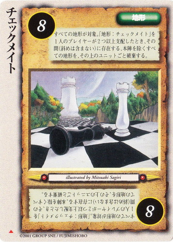 ![]() ![]() | チェックメイト 地形 空中庭園の降臨 ▲ リミット:8 この地形を配置したプレイヤーが戦場に「地形:チェックメイト」を2つ以上配置し、支配したときに効果。 「地形:チェックメイト」の間(斜めは不可)に配置されている本陣以外の地形は、その上のユニットごと破棄される。 illustrated by Hiroyuki Ishida |
