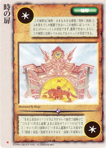![]() ![]() | 時の扉 地形 空中庭園の降臨 ★ リミット:* この地形は「地形:大きな大きな部屋/花咲く旅路」と入れ替えでしか配置できない。この地形には「レベル:3以上」のユニットしか存在できず、進軍できない。さらに、この地形には何レベルぶんでもユニットが存在できる。 illustrated by Kouji |
