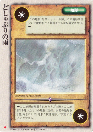 ![]() ![]() | どしゃぶりの雨 地形 空中庭園の降臨 ◆ リミット:* この地形は「リミッt:0体」。この地形は自分の支配地形と入れ替えでしか配置できない。この地形が配置されたとき、「本陣とこの地形」を除いた1つの地形に効果。対象の地形を「裏」向きにして「地形:代理地形」に変更することができる。 illustrated by Ryou Sasaki |