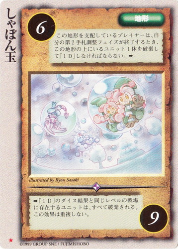 ![]() ![]() | しゃぼん玉 地形 空中庭園の降臨 ★ リミット:6 この地形を支配しているプレイヤーは、自分の第2手札調整フェイズが終了するとき、この地形の上にいるユニット1体を破棄して「1D」しなければならない。「1D」のダイス結果と同じレベルの戦場に存在するユニットは、すべて破棄される。この効果は重複しない。 illustrated by Ryou Sasaki |