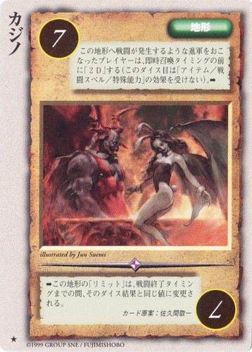 ![]() ![]() | カジノ 地形 空中庭園の降臨 ★ リミット:7 この地形へ戦闘が発生するような進軍をおこなったプレイヤーは、即時召喚タイミングの前に「2D」する(このダイス目は「アイテム/戦闘スペル/特殊能力」の効果を受けない)。この地形のリミットは、戦闘終了タイミングまでの間、そのダイス結果と同じ値に変更される。 カード原案:佐久間敬一 illustrated by Jun Suemi |