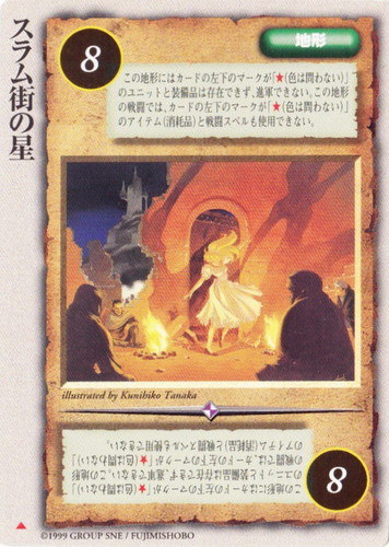 ![]() ![]() | スラム街の星 地形 空中庭園の降臨 ▲ リミット:8 この地形にはカードの左下のマークが「★(色は問わない)」のユニットと装備品は存在できず、進軍できない。この地形の戦闘では、カードの左下のマークが「★(色は問わない)」のアイテム(消耗品)と戦闘スペルも使用できない。 illustrated by Kunihiko Tanaka |