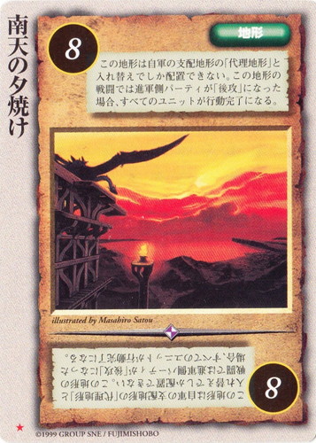 ![]() ![]() | 南天の夕焼け 地形 空中庭園の降臨 ★ リミット:8 この地形は自軍の支配地形の「代理地形」と入れ替えでしか配置できない。この地形の戦闘では進軍側パーティが「後攻」になった場合、すべてのユニットが行動完了になる。 illustrated by Masahiro Satou |