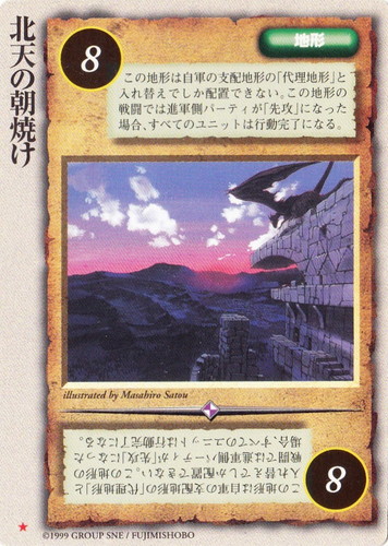 ![]() ![]() | 北天の朝焼け 地形 空中庭園の降臨 ★ リミット:8 この地形は自軍の支配地形の「代理地形」と入れ替えでしか配置できない。この地形の戦闘では進軍側パーティが「先攻」になった場合、すべてのユニットは行動完了になる。 illustrated by Masahiro Satou |