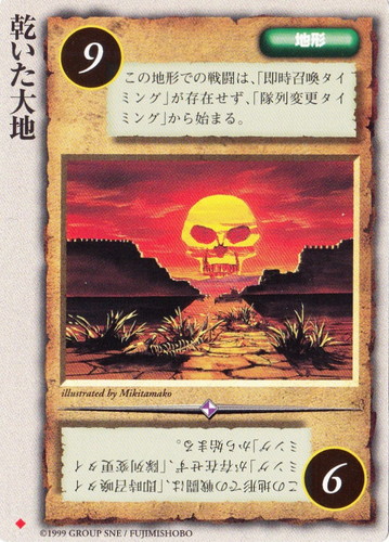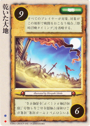 ![]() ![]() | 乾いた大地 地形 空中庭園の降臨 ◆ リミット:9 この地形での戦闘は、「即時召喚タイミング」が存在せず、「隊列変更タイミング」から始まる。 illustrated by Mikitamako |