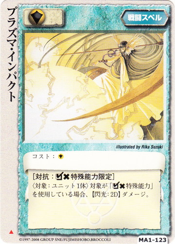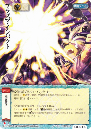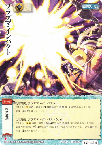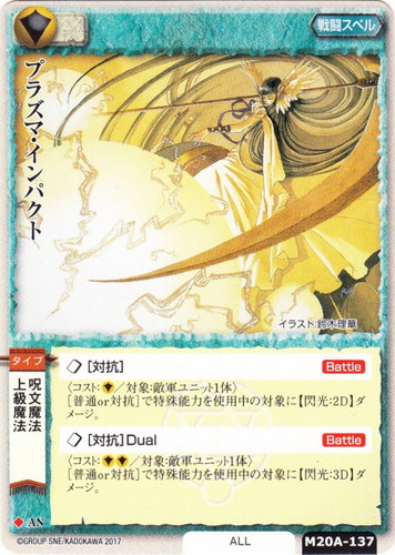 ![]() ![]() | M20A-137 プラズマ・インパクト 戦闘スペル 太陽の金の竜姫 ◆ 属性:聖 ブロック:AN 勢力:ALL タイプ:上級魔法/呪文魔法 ◇[対抗]【Battle】 〈コスト:聖/対象:敵軍ユニット1体〉 [普通or対抗]で特殊能力を使用中の対象に【閃光:2D】ダメージ。 ◇[対抗]Dual【Battle】 〈コスト:聖聖/対象:敵軍ユニット1体〉 [普通or対抗]で特殊能力を使用中の対象に【閃光:3D】ダメージ。 illustrated by 鈴木理華 |
