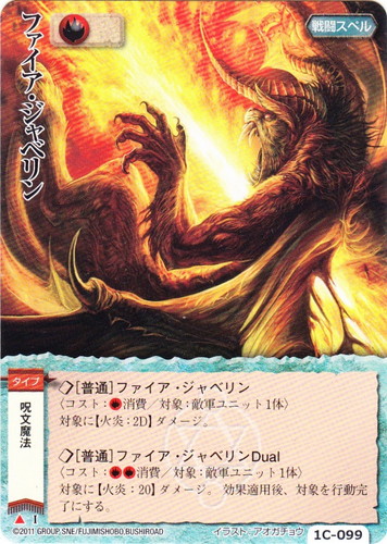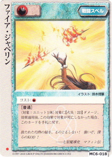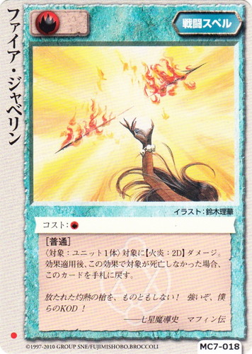 ![]() ![]() | ファイア・ジャベリン 戦闘スペル モンスター・コレクション ▲ 属性:火 [普通] ユニット1体に【火炎:2D】ダメージを与える。 illustrated by Rika Suzuki |