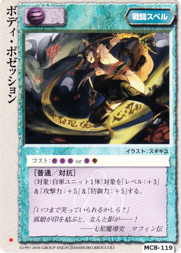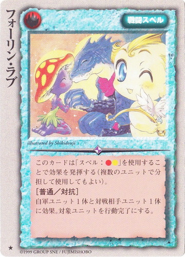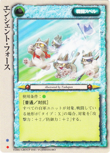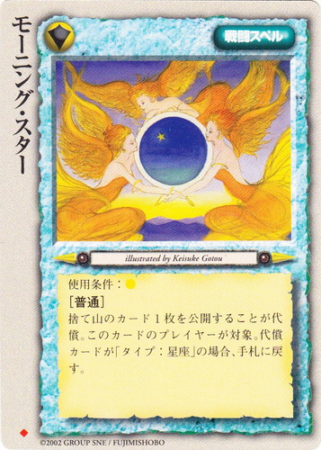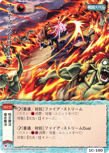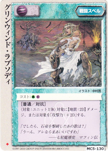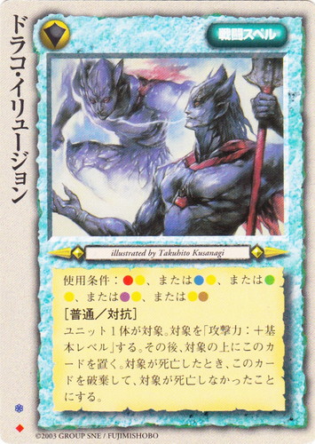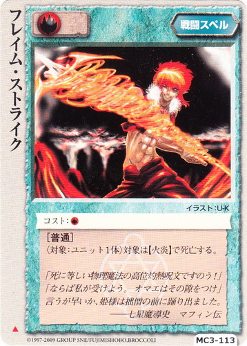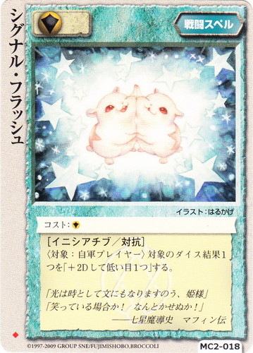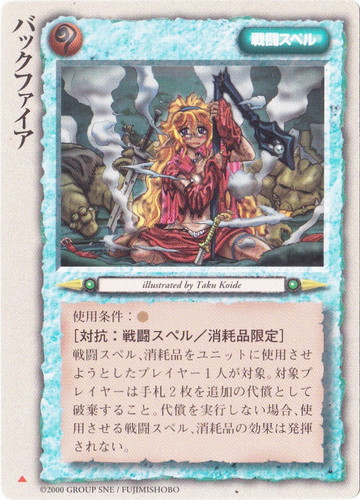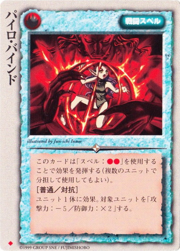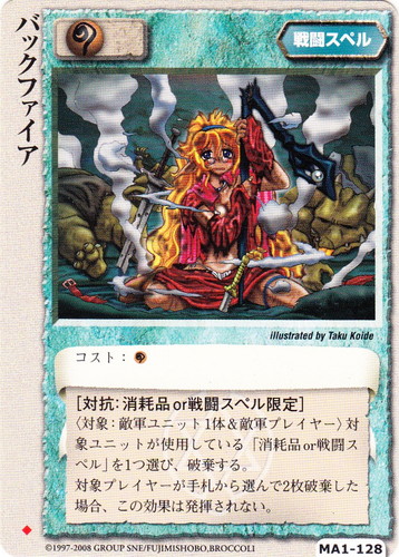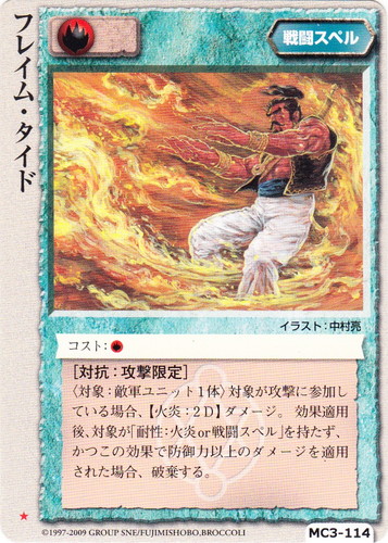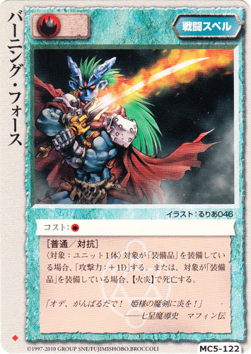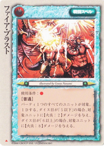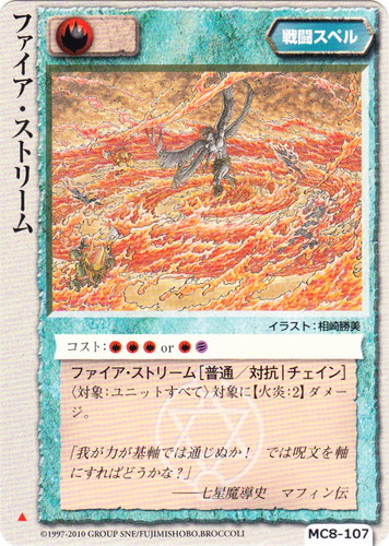 ![]() ![]() | ファイア・サークル 戦闘スペル モンスター・コレクション ★ 属性:火 [普通/対抗] ユニット1体を「属性:火」に変更する。対象ユニットがもとから「属性:火」の場合、「防御力:+1D」する。 illustrated by Jun-ichi Fujikawa |