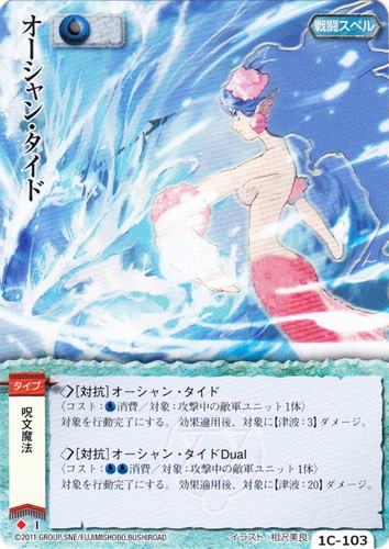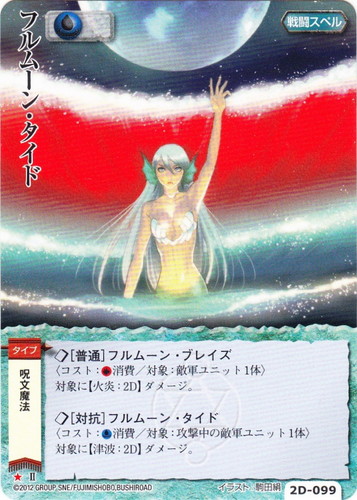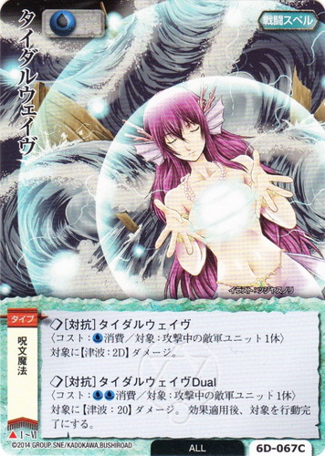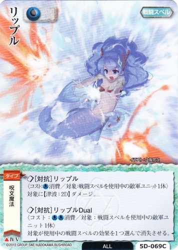 ![]() ![]() | M20A-120 リップル 戦闘スペル 太陽の金の竜姫 ▲ 属性:水 ブロック:AN 勢力:ALL タイプ:上級魔法/呪文魔法 ◇[対抗]【Battle】 〈コスト:水/対象:戦闘スペルを使用中の敵軍ユニット1体〉 対象に【津波:2D】ダメージ。 ◇[対抗]Dual【Battle】 〈コスト:水水/対象:戦闘スペルを使用中の敵軍ユニット1体〉 対象に【津波:3D】ダメージ。 illustrated by 鶴田謙二 |