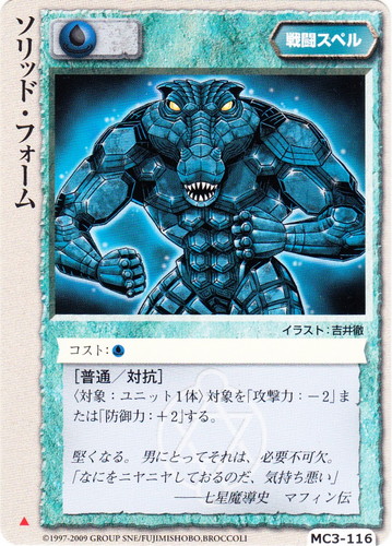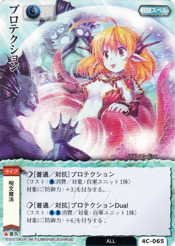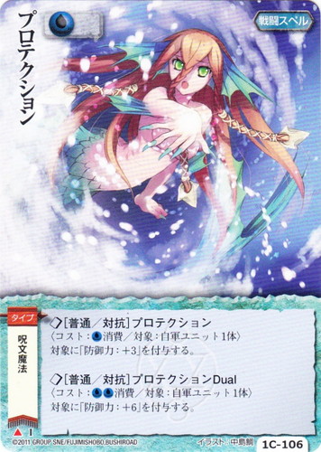 ![]() ![]() | プロテクション 戦闘スペル モンスター・コレクション ▲ 属性:水 [普通/対抗] ユニット1体を「防御力:+3」する。 illustrated by Yuuya Kobayashi |
