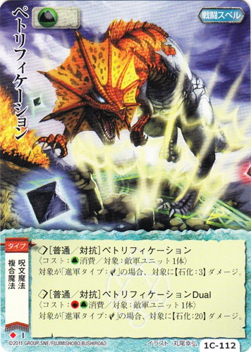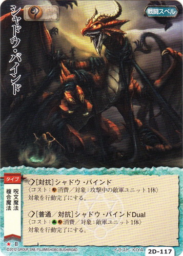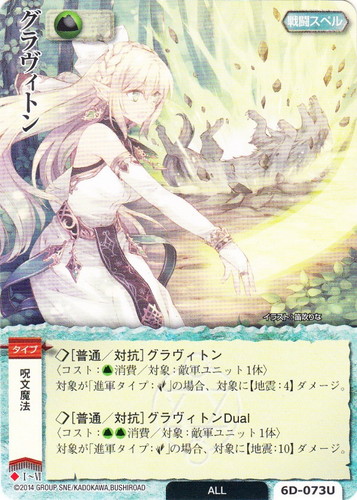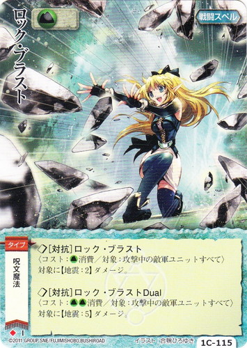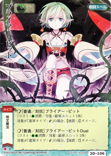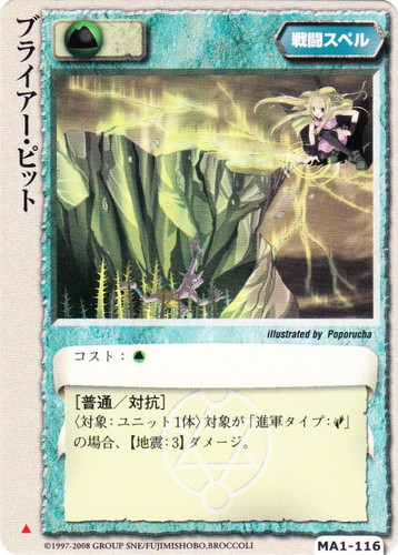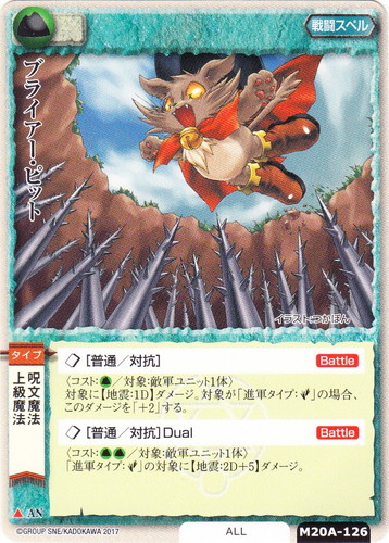 ![]() ![]() | M20A-126 ブライアー・ピット 戦闘スペル 太陽の金の竜姫 ▲ 属性:土 ブロック:AN 勢力:ALL タイプ:上級魔法/呪文魔法 ◇[普通/対抗]【Battle】 〈コスト:土/対象:敵軍ユニット1体〉 対象に【地震:1D】ダメージ。対象が「進軍タイプ:歩行」の場合、このダメージを「+2」する。 ◇[普通/対抗]Dual【Battle】 〈コスト:土土/対象:敵軍ユニット1体〉 「進軍タイプ:歩行」の対象に【地震:2D+5】ダメージ。 illustrated by つかぽん |