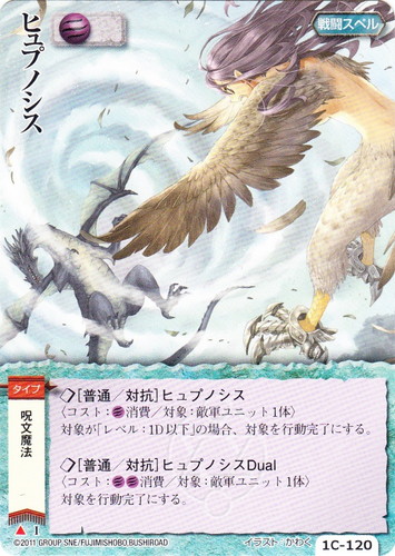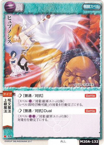 ![]() ![]() | M20A-132 ヒュプノシス 戦闘スペル 太陽の金の竜姫 ◆ 属性:風 ブロック:AN 勢力:ALL タイプ:上級魔法/呪文魔法 ◇[普通/対抗]【Battle】 〈スペル:風/対象:敵軍ユニット1体〉 「レベル:即時召喚可能」の対象を行動完了にする。 ◇[普通/対抗]Dual【Battle】 〈スペル:風風/対象:敵軍ユニット1体〉 対象を行動完了にする。 illustrated by 佐嶋真実 |