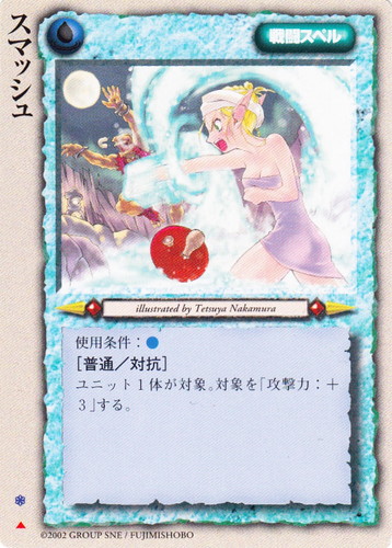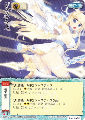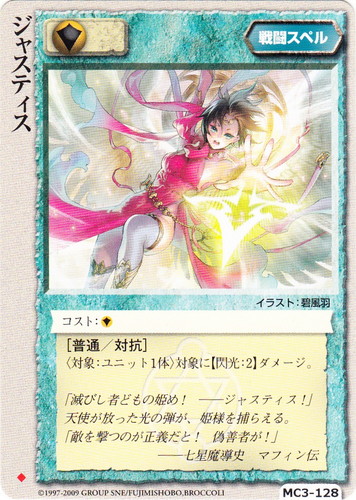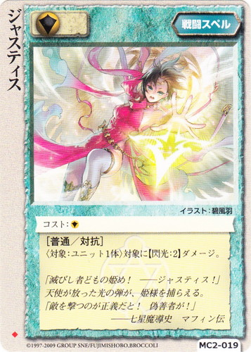 ![]() ![]() | ジャスティス 戦闘スペル モンスター・コレクション ◆ 属性:聖 [普通/対抗] ユニット1体に【2】ダメージを与える。 illustrated by Tamaki Ishigaki |