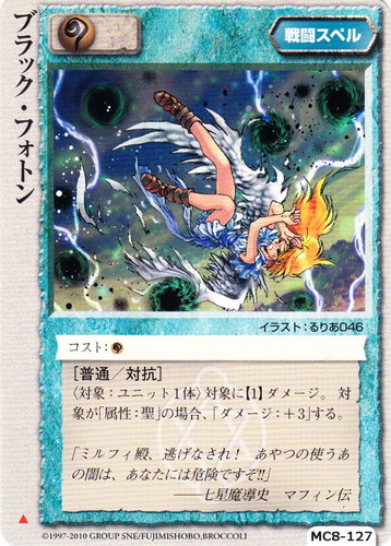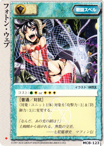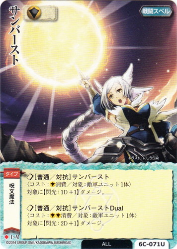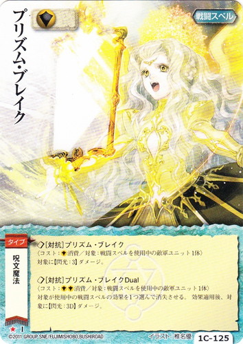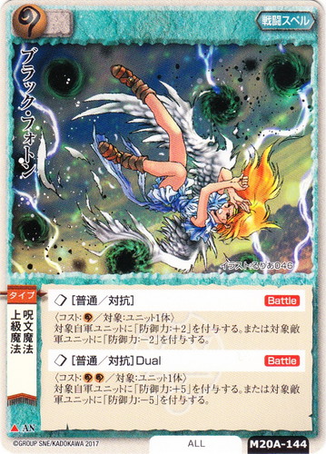 ![]() ![]() | M20A-144 ブラック・フォトン 戦闘スペル 太陽の金の竜姫 ▲ 属性:魔 ブロック:AN 勢力:ALL タイプ:上級魔法/呪文魔法 ◇[普通/対抗]【Battle】 〈コスト:魔/対象:ユニット1体〉 対象自軍ユニットに「防御力:+2」を付与する。または対象敵軍ユニットに「防御力:-2」を付与する。 ◇[普通/対抗]Dual【Battle】 〈コスト:魔魔/対象:ユニット1体〉 対象自軍ユニットに「防御力:+5」を付与する。または対象敵軍ユニットに「防御力:-5」を付与する。 illustrated by るりあ046 |